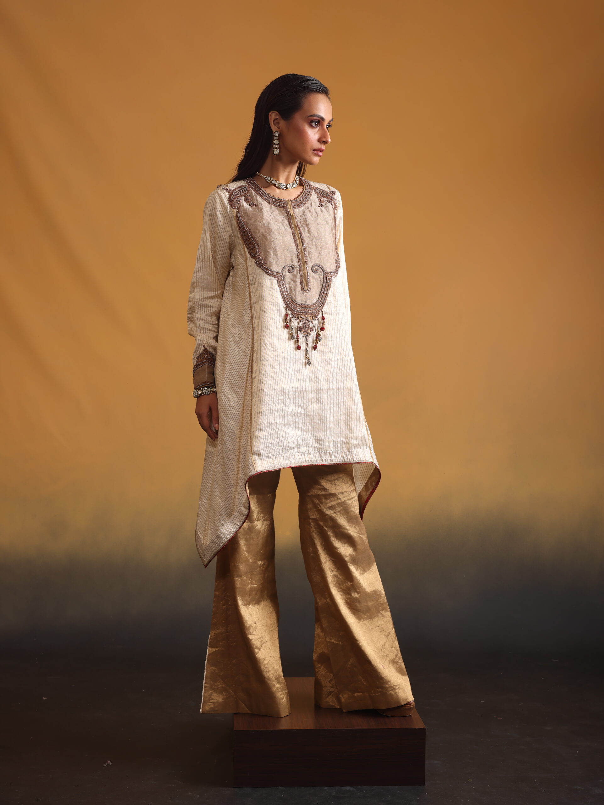 A golden vision with structured silhouette, intricate detailing, and quiet power.